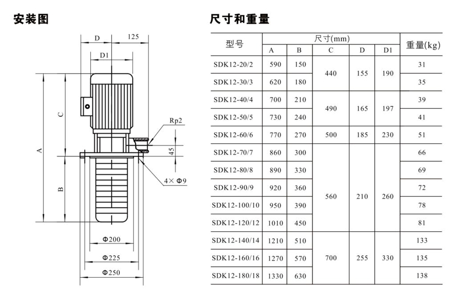 SDK12/SDKT12為配用標(biāo)準(zhǔn)電機(jī)的非自吸立式多級離心泵,電機(jī)軸和泵軸用聯(lián)軸器直接聯(lián)接的結(jié)構(gòu)。為滿足水槽或容器的安裝深度,可安裝空套的腔體來改變泵本身的侵入 深度。